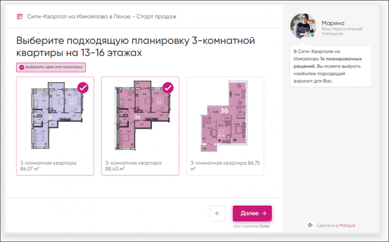 Квизы стали популярным способом вовлечения клиентов. Это анкета из 5–7 вопросов, которая помогает пользователю определить предпочтения и подобрать подходящие квартиры. Преимущество квизов в том, что они дают высокую конверсию (более 50%), что помогает увеличить базу контактов и улучшить взаимодействие с аудиторией.