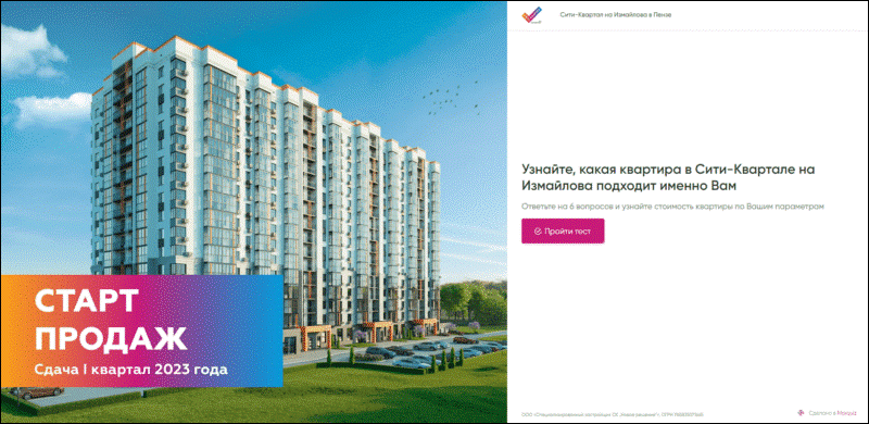 Обложка обязательно должна мотивировать на его прохождение, поэтому здесь можно разместить УТП для целевых клиентов (выгодная стоимость, низкая ставка по ипотеке, хорошее месторасположение объекта и больше других предложений). Если есть вопросы о жилплощади, количестве комнат и этаже, то в этом случае в зависимости от ответов должны отдельно предлагаться варианты планировок подходящих квартир и на указанном этаже.