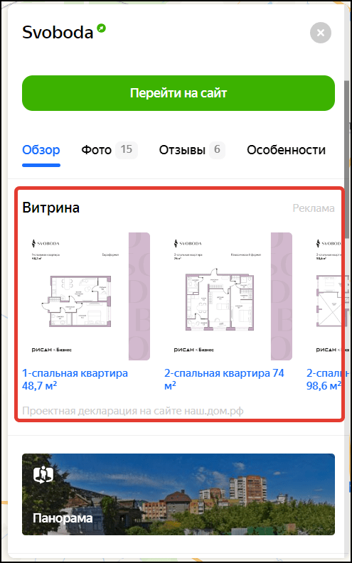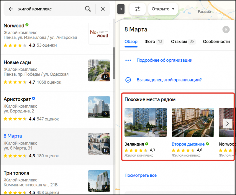 - Размещение карточки жилого комплекса в блоке «похожие организации» на карточках конкурентов, у которых не подключено приоритетное размещение.