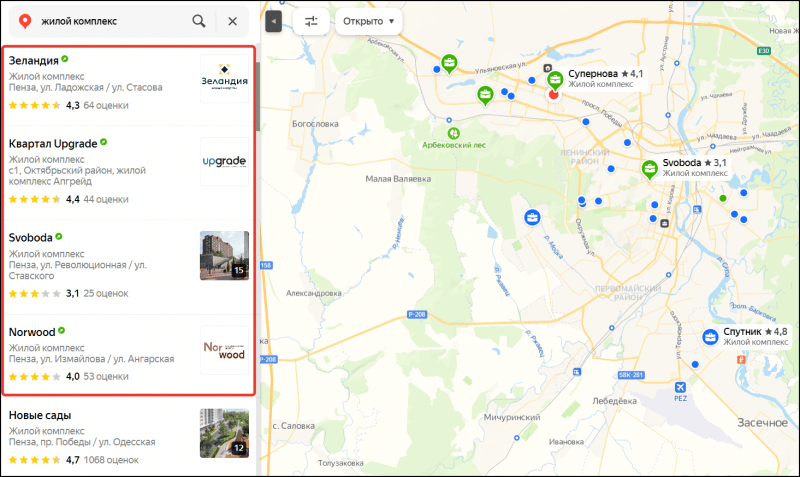 - Поднятие карточки жилого комплекса в ТОП-10 в поисковой выдаче Яндекс.Карт.