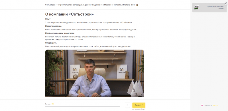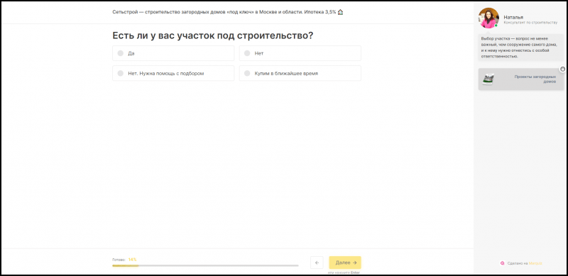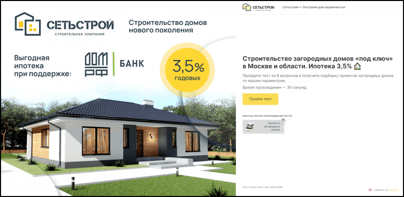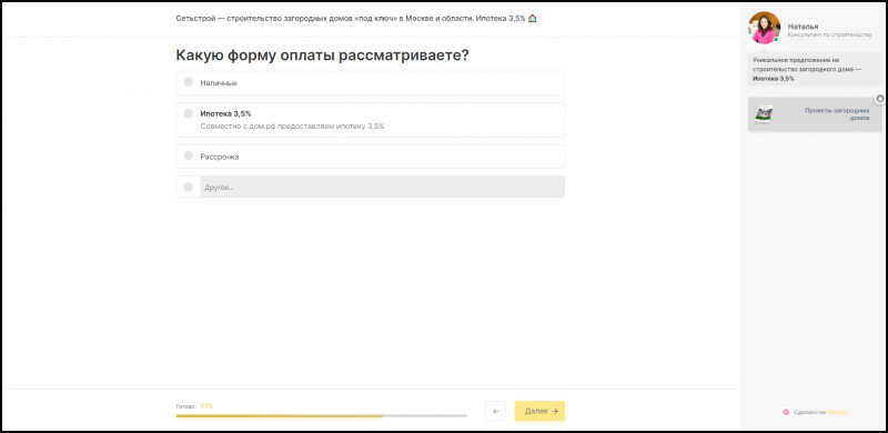 Квиз – одностраничный сайт с опросом, отличающийся простотой использования. Его механика позволяет тестировать различные гипотезы, оставляя в работе лучшие варианты. Наша команда выявила, что выигрышным оффером для частного домостроительства является информация об ипотеке.