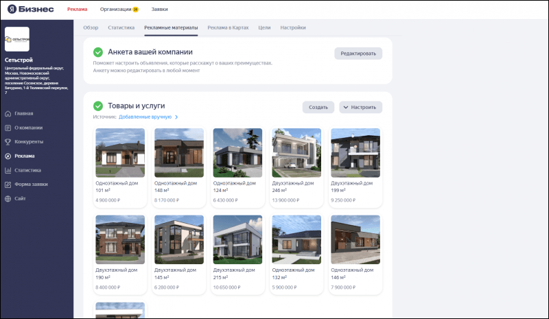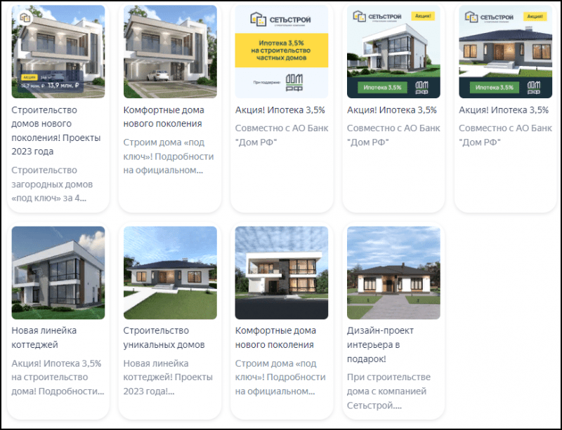 В качестве основного формата можно использовать текстово-графические объявления, состоящие из изображения, текста и ссылки. В них мы делаем акцент на формате работ «под ключ», соответствии домов требованиям ГОСТ и гарантийном сроке. Очень важно прикрепить отрисованные проекты домов, полностью соответствующие реальному внешнему виду вашего будущего дома.