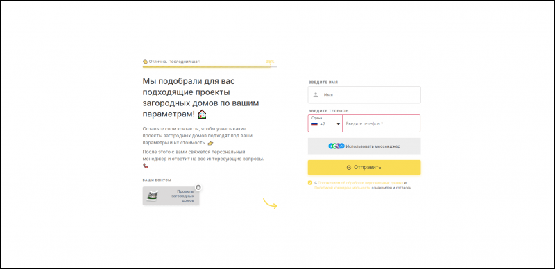 Заключительный раздел стандартно содержит призыв оставить контакты в форме обратной связи + компании желательно придумать бонус за прохождение теста (список проектов частных домов, расчёт стоимости др.).