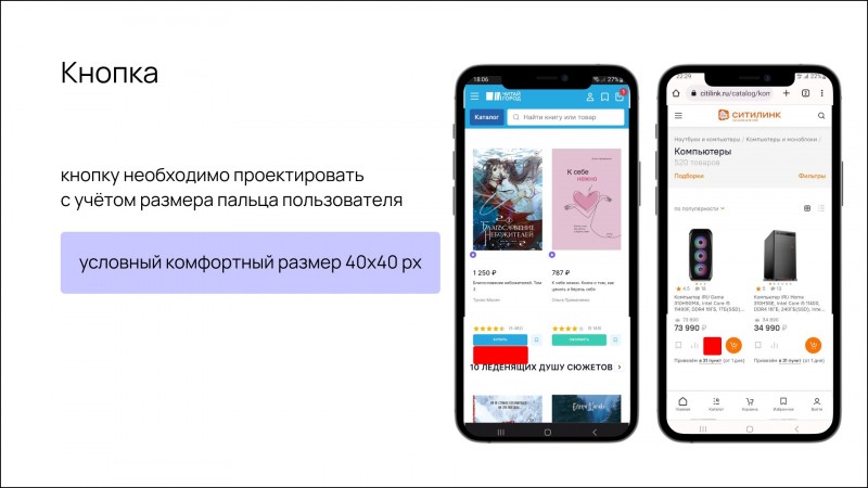 Также стоит отдельно подумать о дальнейшем взаимодействии пользователя с сайтом. Из базового – кнопку для заказа в мобильной версии нельзя делать размером менее 40×40 px, иначе кликнуть по ней будет достаточно проблематично.