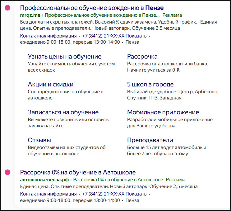 Составлены уникальные и привлекательные тексты объявлений с акцентом на преимущества автошколы: возможность обучения рядом с домом, гибкий график занятий. - Настройка кампаний: