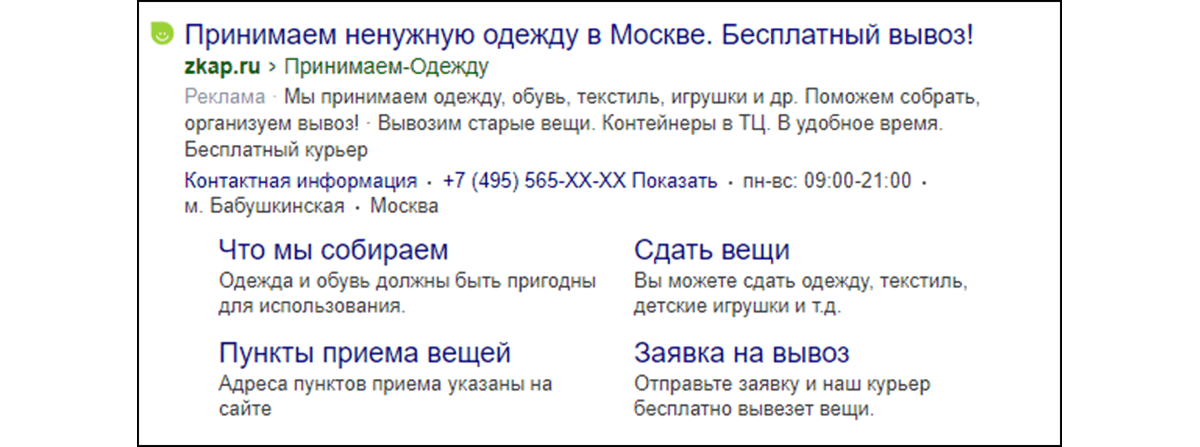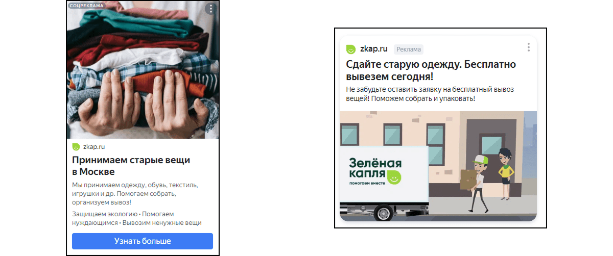 Также, мы приняли решение разработать на сайте отдельную страницу под трафик с контекстной рекламы, где давалась основная информация о проекте «Зеленая капля»: услуги, алгоритм работы и форма заявки. Ссылка на страницу: https://zkap.ru/kak-mozhno-sdat-nenuzhnuyu-odezhdu-v-moskve/.