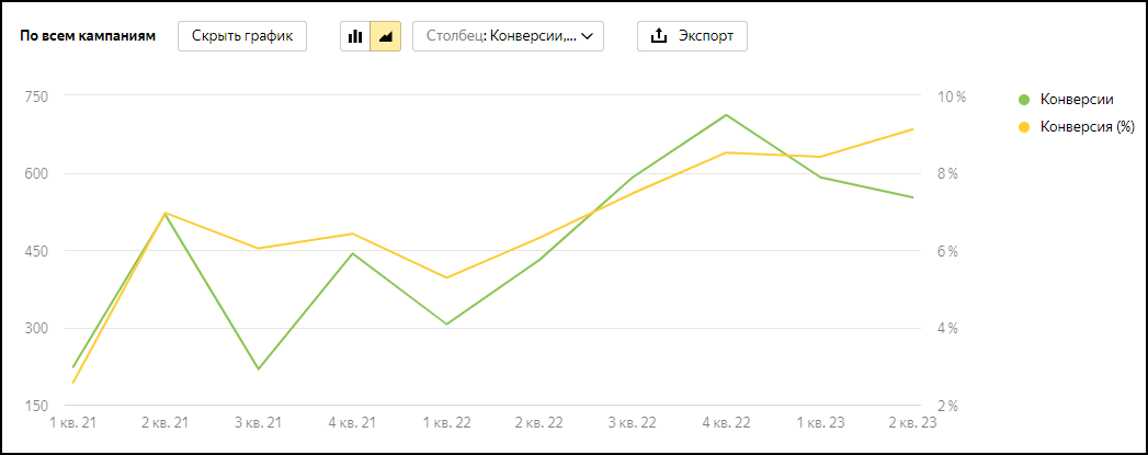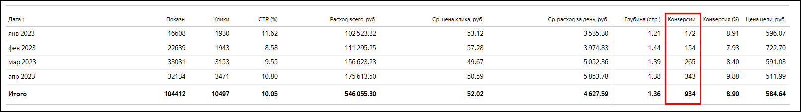Рисунок 11. Конверсия по проекту. Статистика в Яндекс.Директ