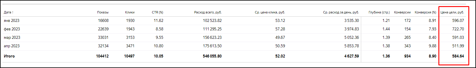 Рисунок 12. Стоимость одного обращения по проекту. Статистика в Яндекс.Директ