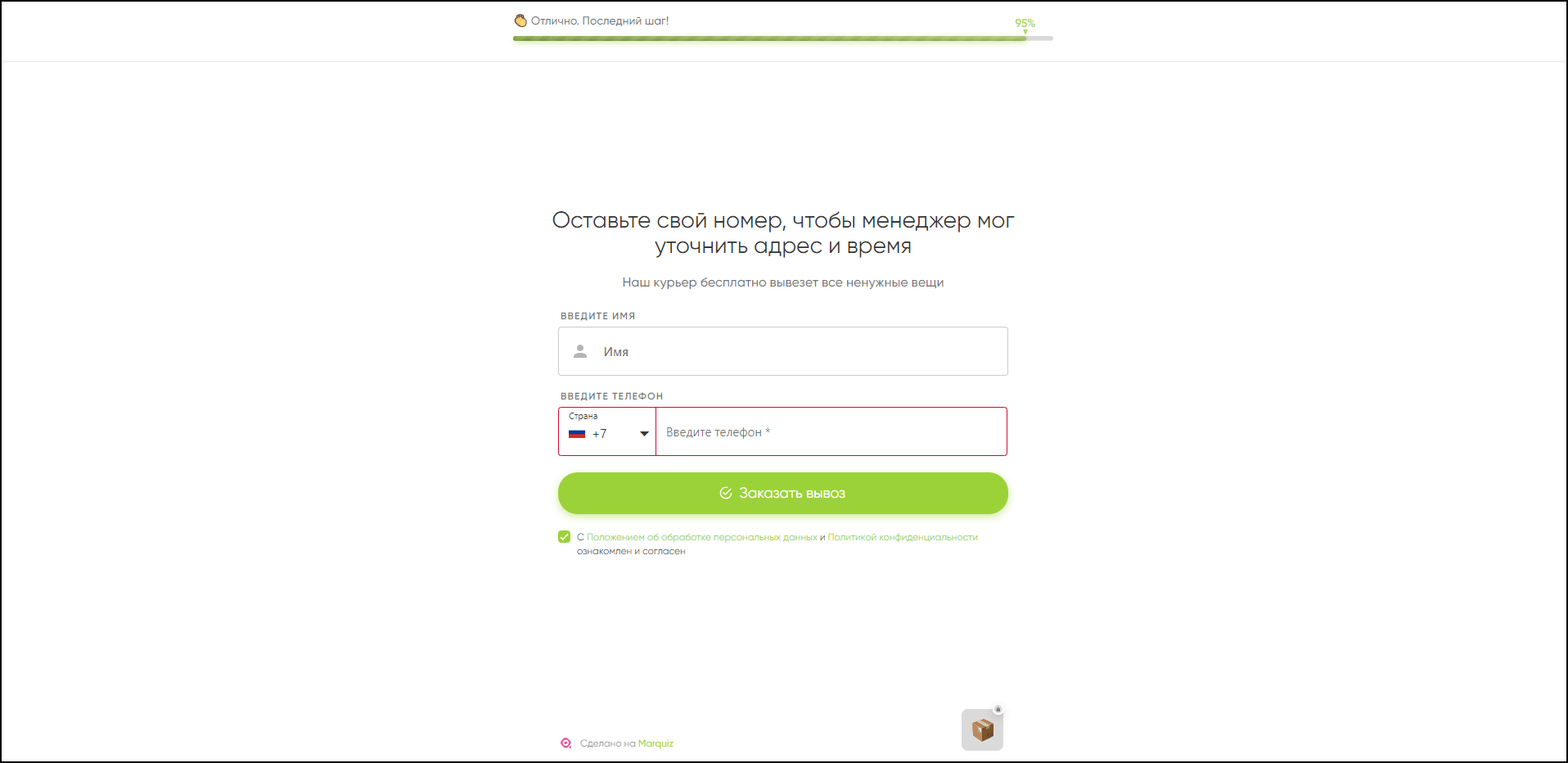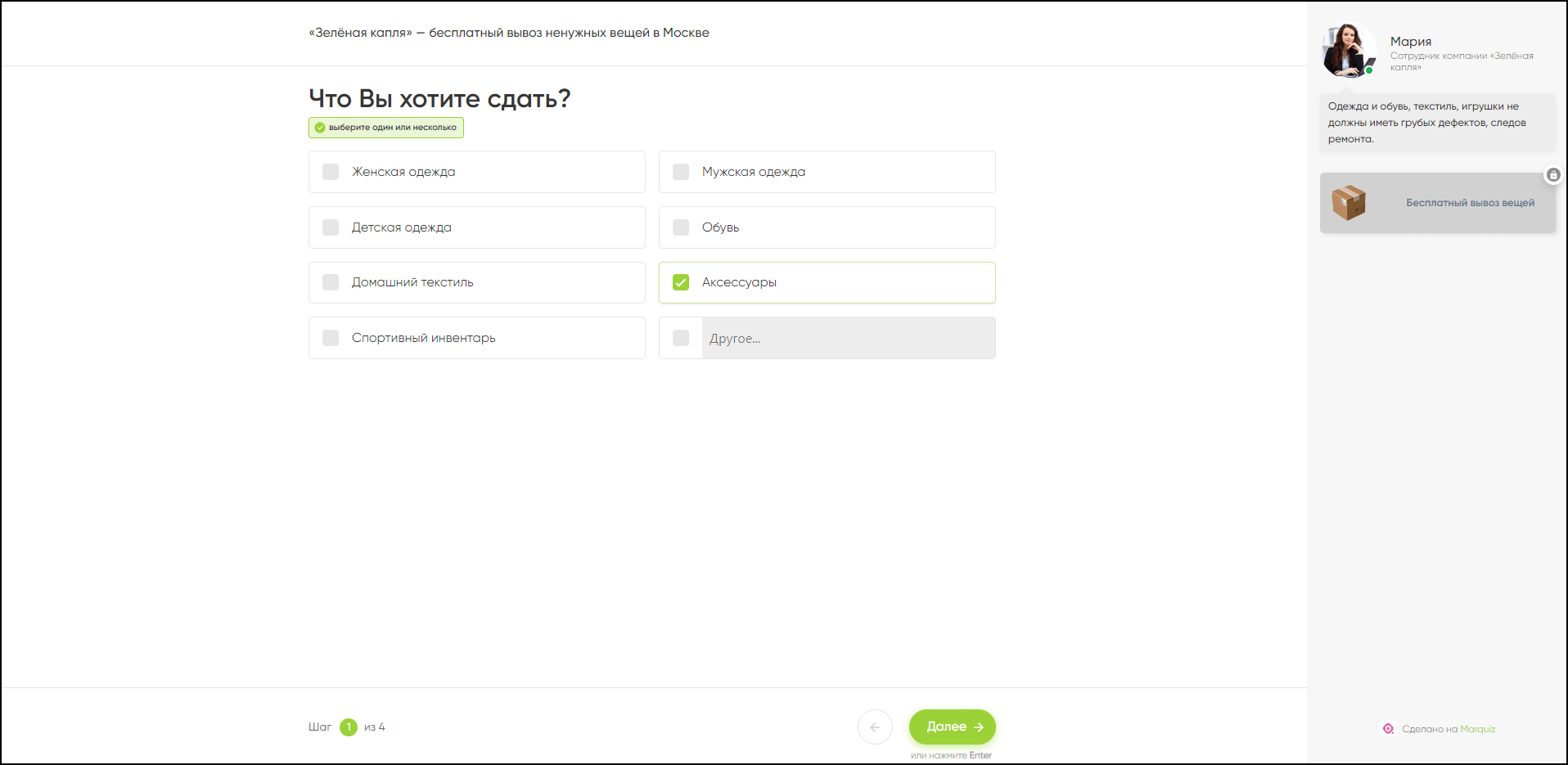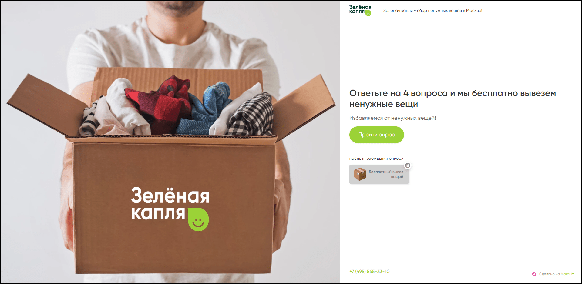На главной странице квиза мы разместили информацию о том, что «Зёленая капля» является сервисом по вывозу ненужных вещей, а далее в процессе прохождения квиза пользователю предлагается ответить на 4 вопроса: