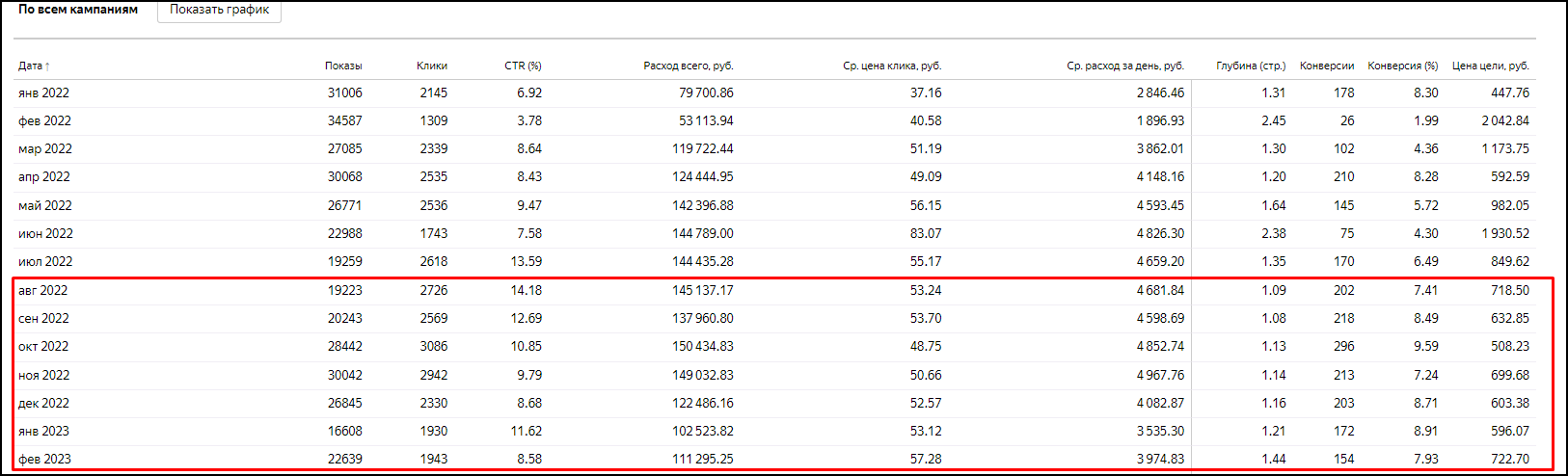 На скриншоте ниже выделены данные за период с августа 2022 года по февраль 2023 года.