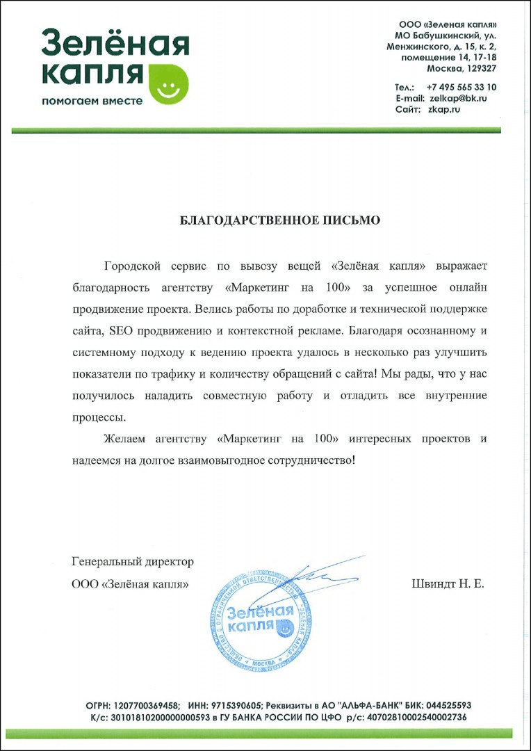 Городской сервис по вывозу вещей «Зелёная капля» выражает благодарность агентству «Маркетинг на 100» за успешное онлайн продвижение проекта. Велись работы по доработке и технической поддержке сайта, SEO продвижению и контекстной рекламе. Благодаря осознанному и системному подходу к ведению проекта удалось в несколько раз улучшить показатели по трафику и количеству обращений с сайта! Мы рады, что у нас получилось наладить совместную работу и отладить все внутренние процессы. Желаем агентству «Маркетинг на 100» интересных проектов и надеемся на долгое взаимовыгодное сотрудничество!