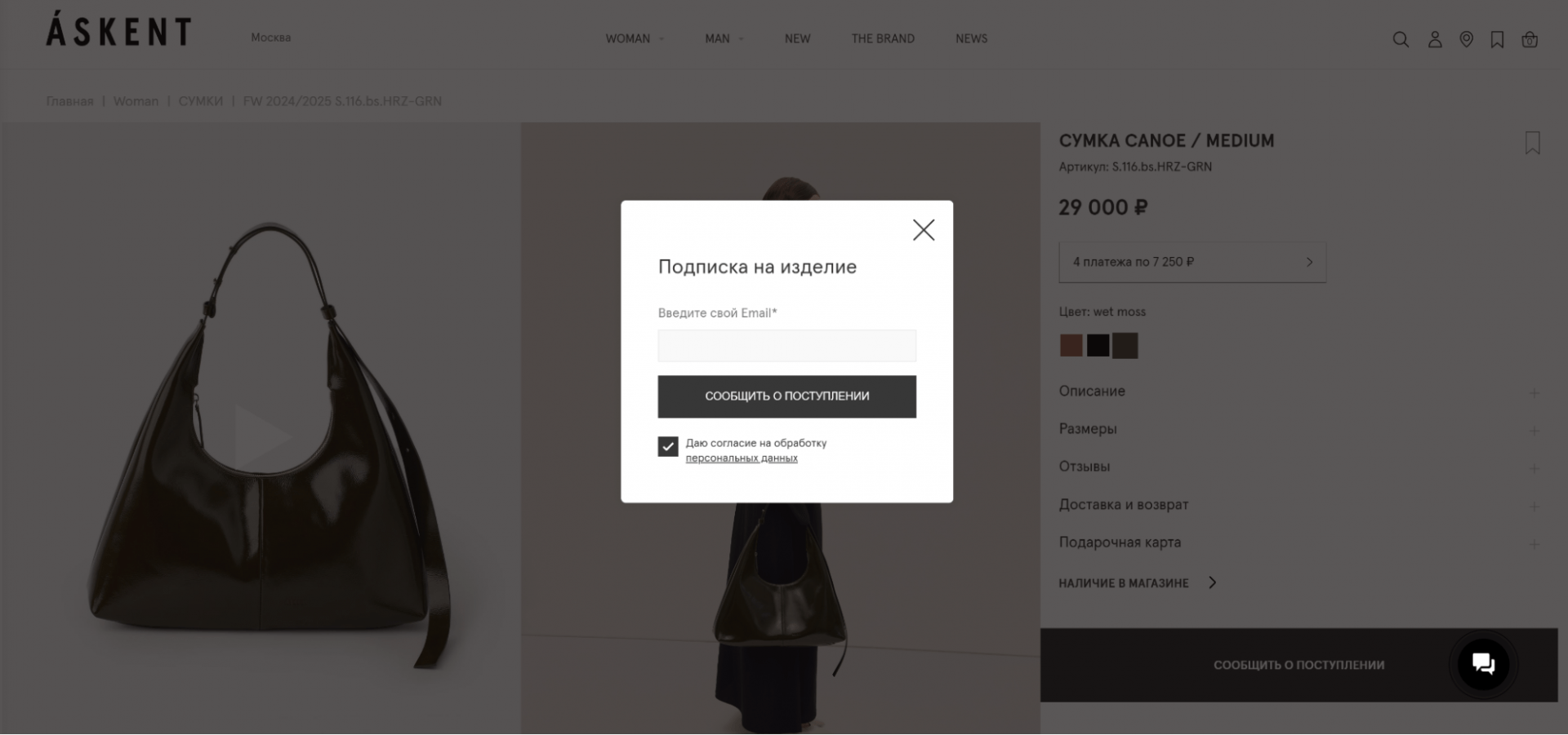 Реализованы формы для подписки на уведомления о поступлении товара, а также динамические элементы, позволяющие пользователю быстро переходить к оформлению заказа (например, форма с выбором: перейти в корзину или продолжить покупки).