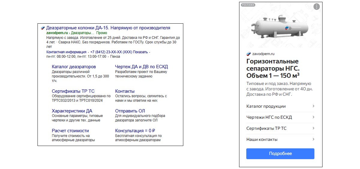 Объявления создавались с упором на технические характеристики продукта и условия сделки. Указание конкретных показателей (объемов резервуаров, сроков изготовления и доставки и. т. д.) стало дополнительным «фильтром» для отсеивания нецелевой аудитории, что позволило сэкономить бюджет.