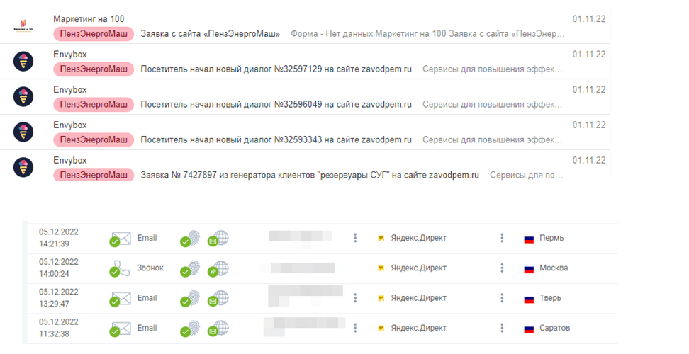 По причине того, что в B2B-нише основная часть обращений приходит через входящие звонки, а также прямые письма на email, было принято решение подключить сервис email-трекинга и call-трекинга. Для того, чтобы понимать, насколько эффективно работает реклама и вносить корректировки, отталкиваясь от реальных показателей, мы настроили цели в Яндекс.Метрике на каждый тип входящего обращения: заявки с форм, входящие звонки, письма на email, сообщения в чат, обращения через виджеты на сайте (генератор клиентов и обратный звонок от Envybox).