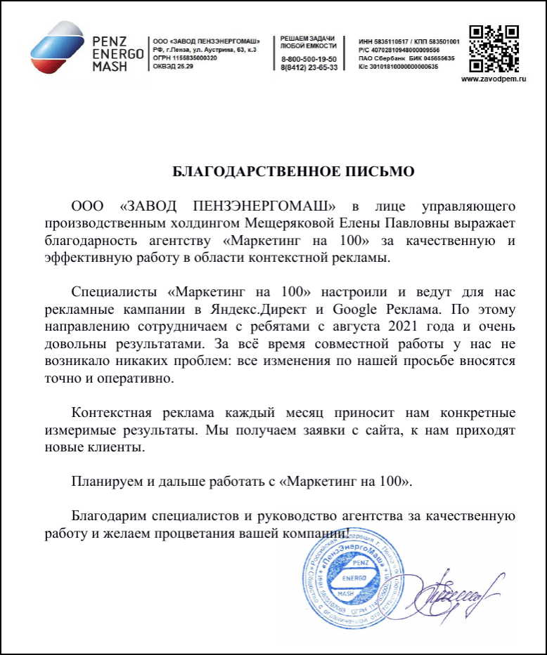 Контекстная реклама каждый месяц приносит нам конкретные измеримые результаты. Мы получаем заявки с сайта, к нам приходят новые клиенты. За всё время совместной работы у нас не возникало никаких проблем: все изменения по нашей просьбе вносятся точно и оперативно. Планируем и дальше работать с «Маркетинг на 100». Благодарим специалистов и руководство агентства за качественную работу.