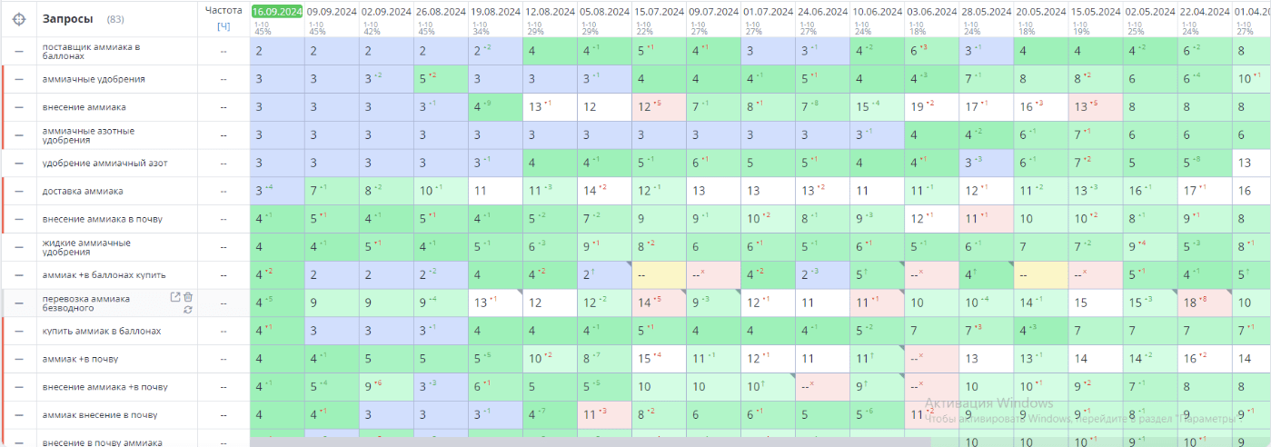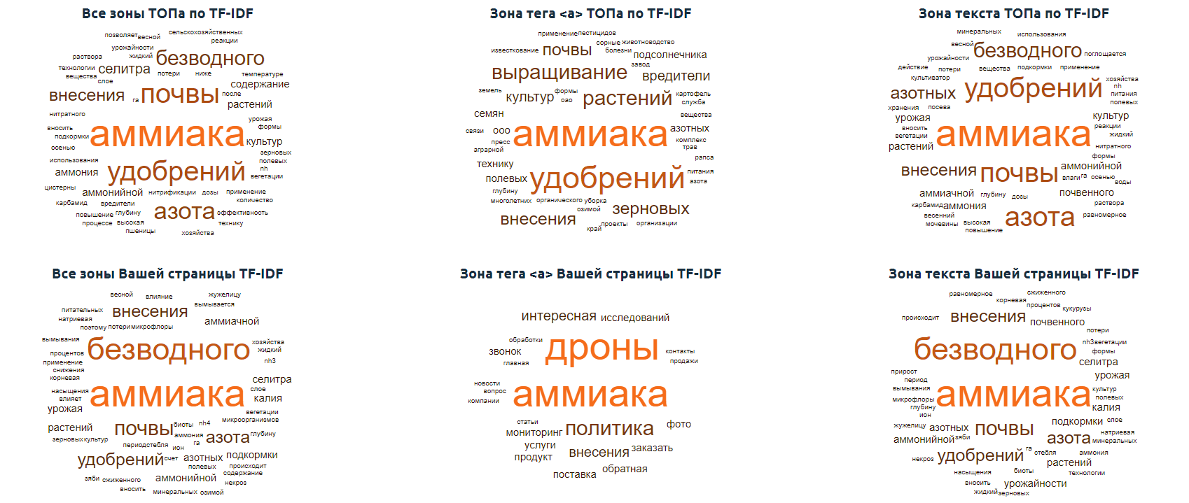 В данном случае мы имеем дело с запросом смешанного интента, т. е. прямо не относящимся ни к коммерческому, ни к информационному типу. Также анализ показал, что аналогичные коммерческие сайты, занимающиеся внесением аммиака, в качестве целевой страницы используют следующие страницы.