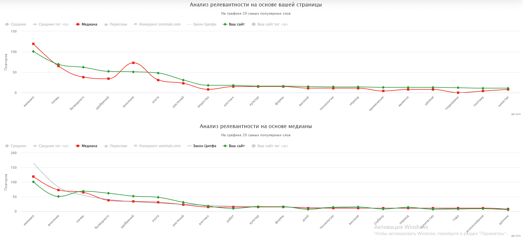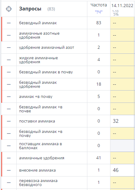 В качестве примера приведем текущие показатели релевантности страницы Внесение аммиака.