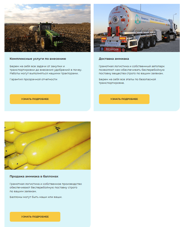 Внесение аммиака, хоть и является наиболее маржинальной услугой компании, но здесь у нее достаточно много конкурентов. Также «Аммиак сервис» продает аммиак оптом в баллонах и занимается доставкой аммиака на поля. Поэтому на сайте был размещен перечень всех услуг, для каждой из которых была создана своя страница.