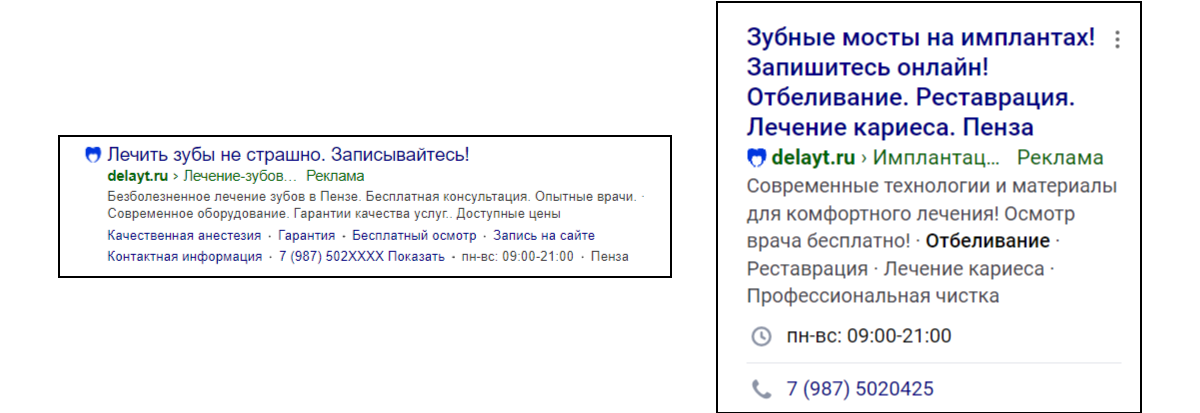 В зависимости от формулировки запроса, объявления ведут на главную страницу сайта или же на страницы услуг, где пациент может получить консультацию и записаться на приём. С целью привлечения стабильного потока пациентов, была увеличена ставка для тех, кто проживает в районе 100 и 1 000 метрах от клиники.