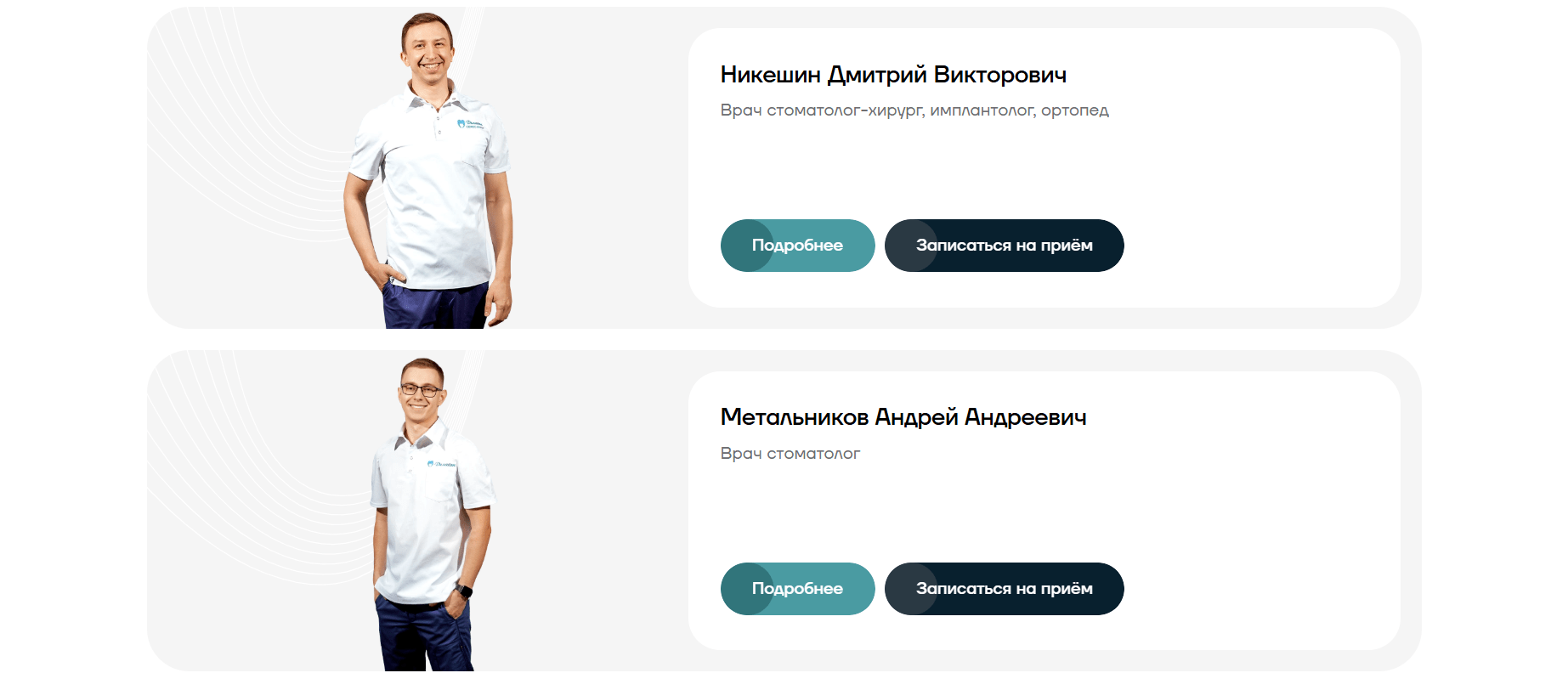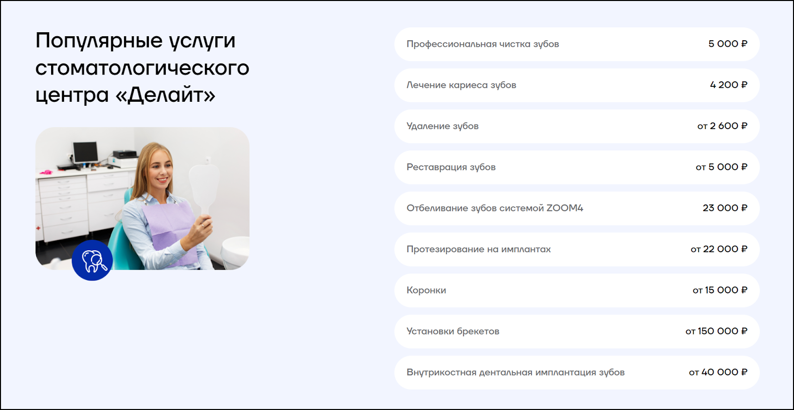 Наша команда предложила несколько вариантов дизайн-концепта, ориентируясь на брендбук стоматологии. Кроме того, мы запросили качественные фотографии, так как пациенты нуждаются в наглядном доказательстве оснащенности медучреждения новейшим оборудованием и пр.