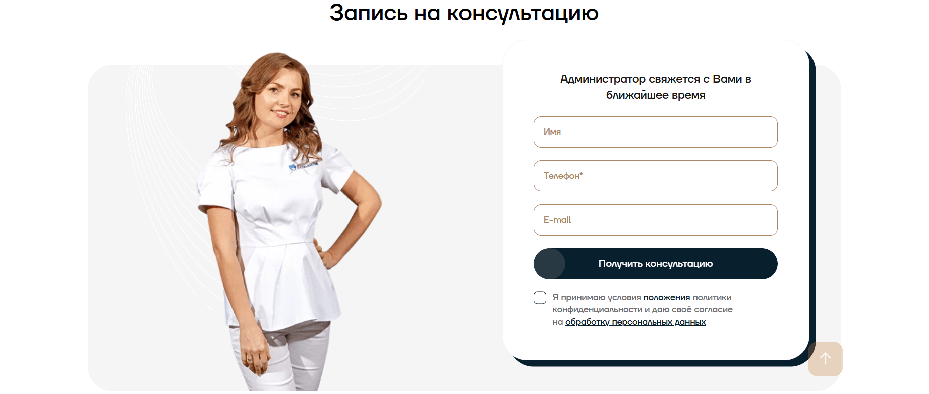 Для повышения конверсии были размещены формы «Записаться на приём», «Заказать звонок», «Получить консультацию», «Запись на консультацию». Контактные данные, введённые пользователем, проходят автоматическую проверку до отправки формы, что устраняет проблему некорректного ввода.