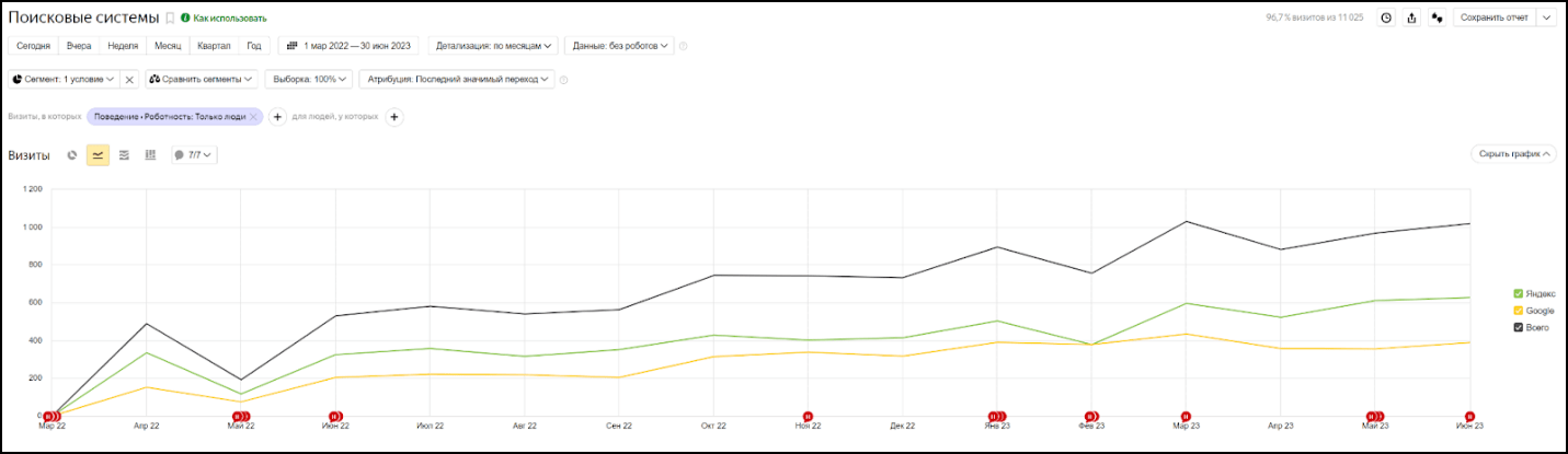Чтобы иметь возможность корректно оценивать продвижение в интернете, мы настроили систему аналитики Яндекс.Метрика. Данный сервис помог нам не только отслеживать количество и источники обращений, но и более эффективно управлять рекламными кампаниями.