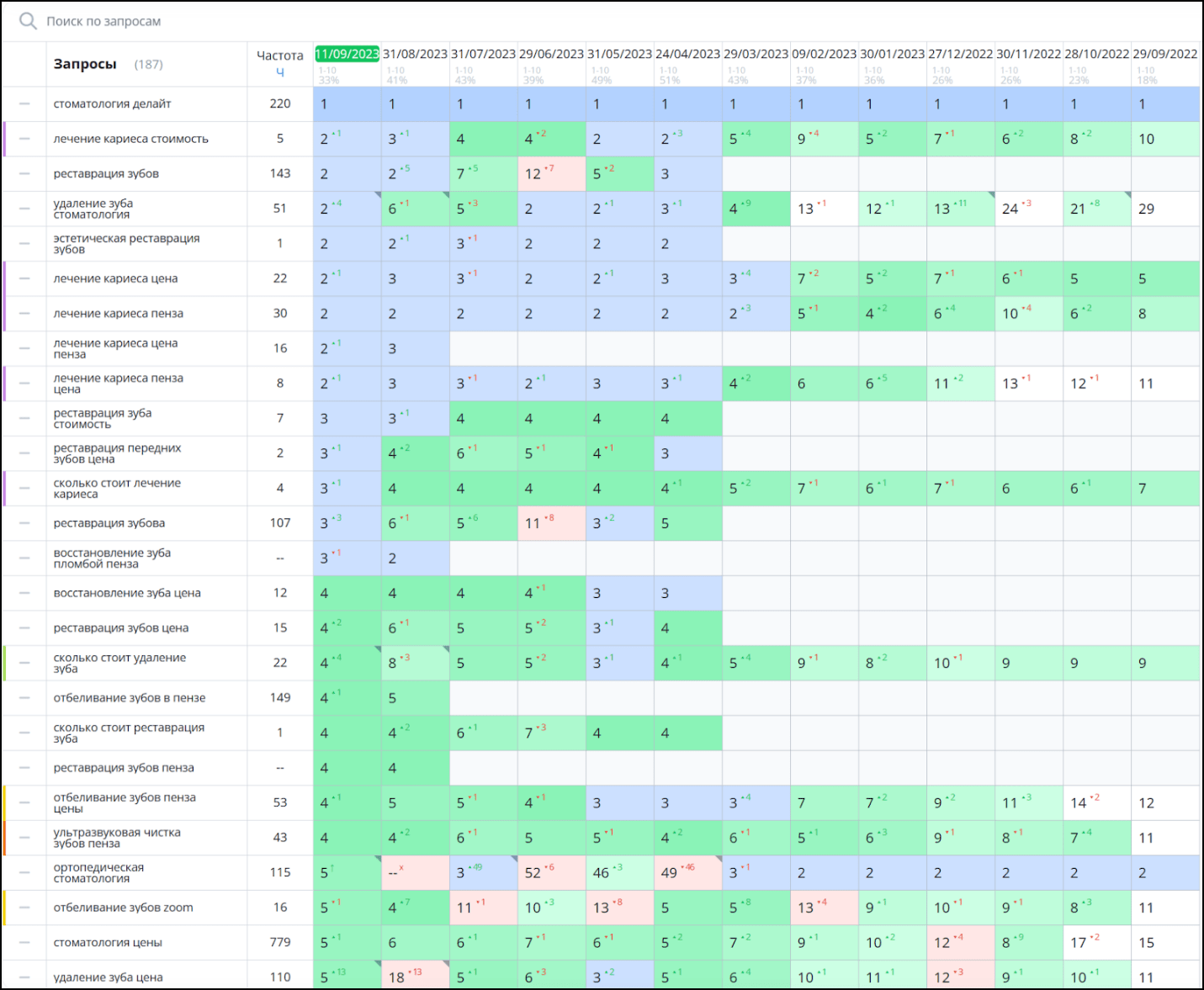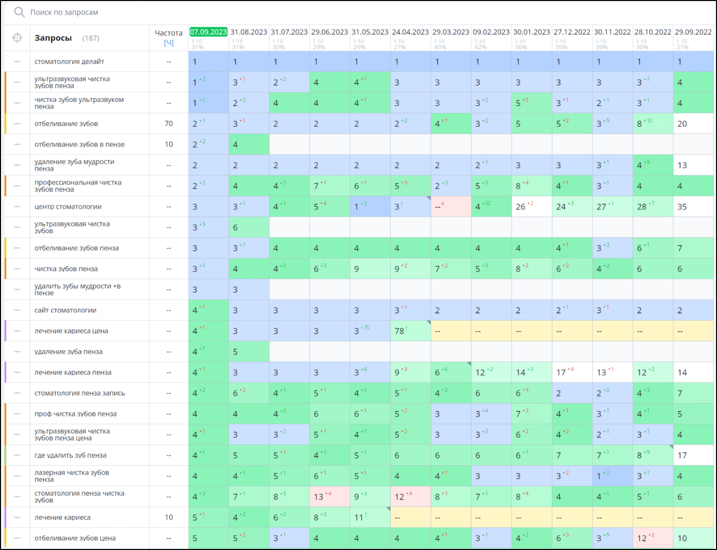 Первым этапом мы проанализировали ТОП выдачи по основным направлениям и выявили, что 60% занимают крупные агрегаторы (prodoctorov.ru, mediclinic.ru, zoon.ru, 32top.ru), а 40% – сайты частных стоматологий. Вывод: высокочастотные запросы являются слишком конкурентными и основной упор стоит сделать на средне-, низкочастотные запросы, т. к. конкуренция по ним более низкая и есть шанс быстрого попадания в верхние позиции ТОПа.