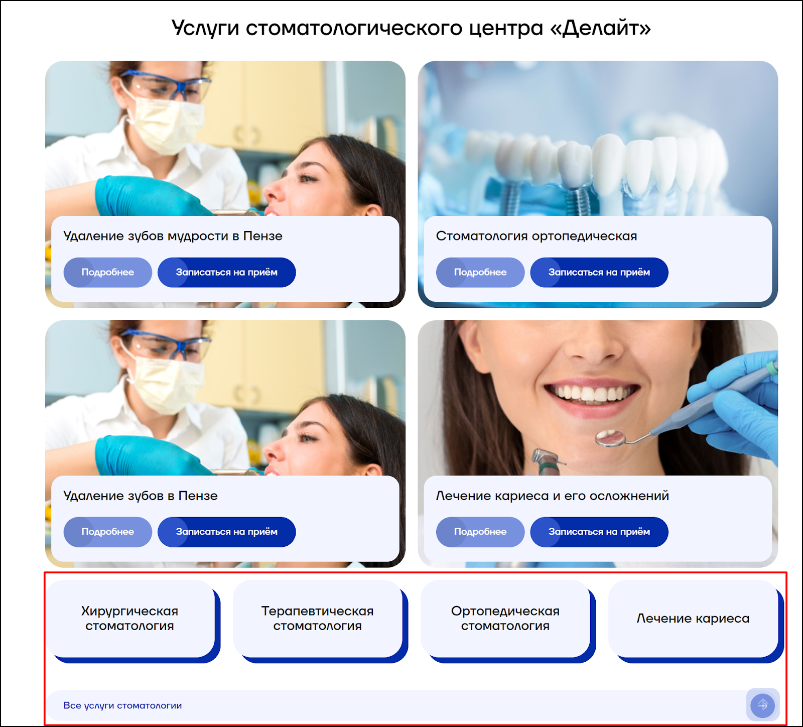- ключевые слова: стоматология Пенза, записаться в стоматологию в Пензе, лечение кариеса в Пензе, платная стоматология в Пензе и пр.