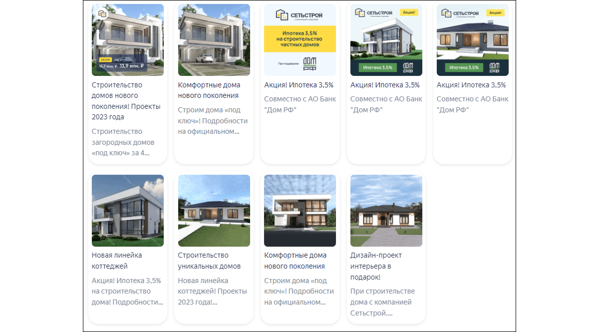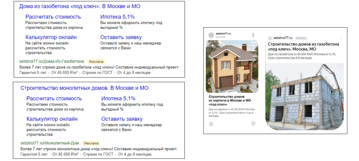 Для поисковой и контекстной рекламы было решено собирать самые целевые коммерческие запросы с упоминанием материала для строительства жилых объектов. Пример: «построить дом +из кирпича под ключ цена».