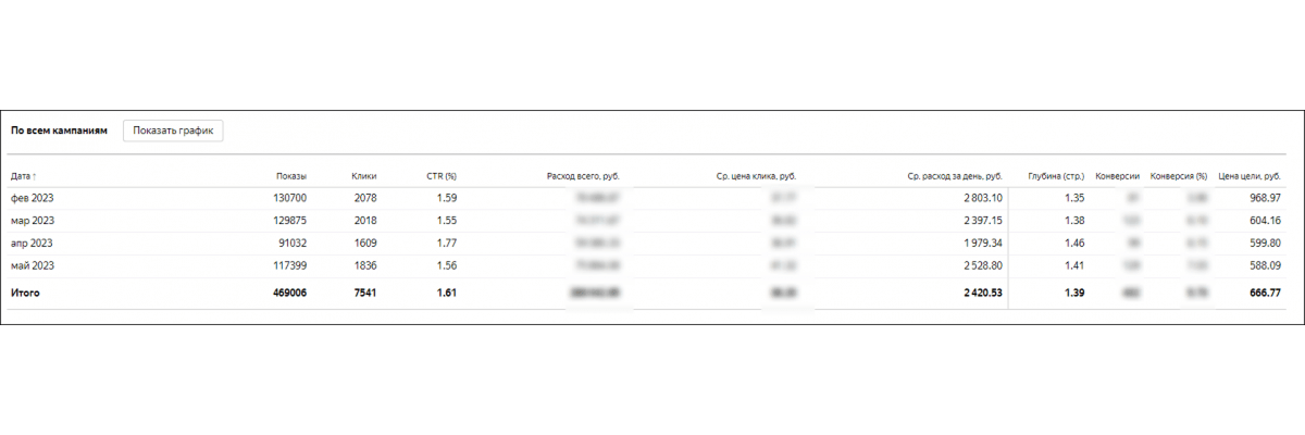 В феврале 2023 года возобновили рекламные кампании чтобы подготовиться к сезону. Реклама подорожала за это время, клики стали стоить дороже на 20-30% в связи с этим при том же количестве трафика у нас увеличился бюджет и выросла стоимость обращения. Тем не менее результаты по рекламе остаются на высоком уровне – высокий % конверсии и цена лида на уровне 588 ₽ на строительство домов в Москве и МО.