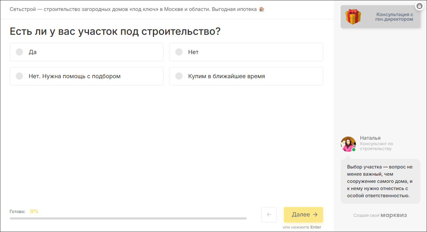 - перевести 95% рекламного трафика с сайта на квиз;