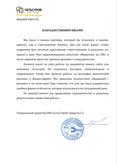 Коллеги взяли на себя работы по разработке нового сайта для компании Сетьстрой. Он получился быстрым, технологичным И современным. Также они провели работы по настройке контекстной рекламы в Яндекс.Директ. Мы довольны количеством обращений с рекламы и их качеством! Еще отметим, что для нас была разработана удобная форма отчётности, которая используется по сегодняшний день.