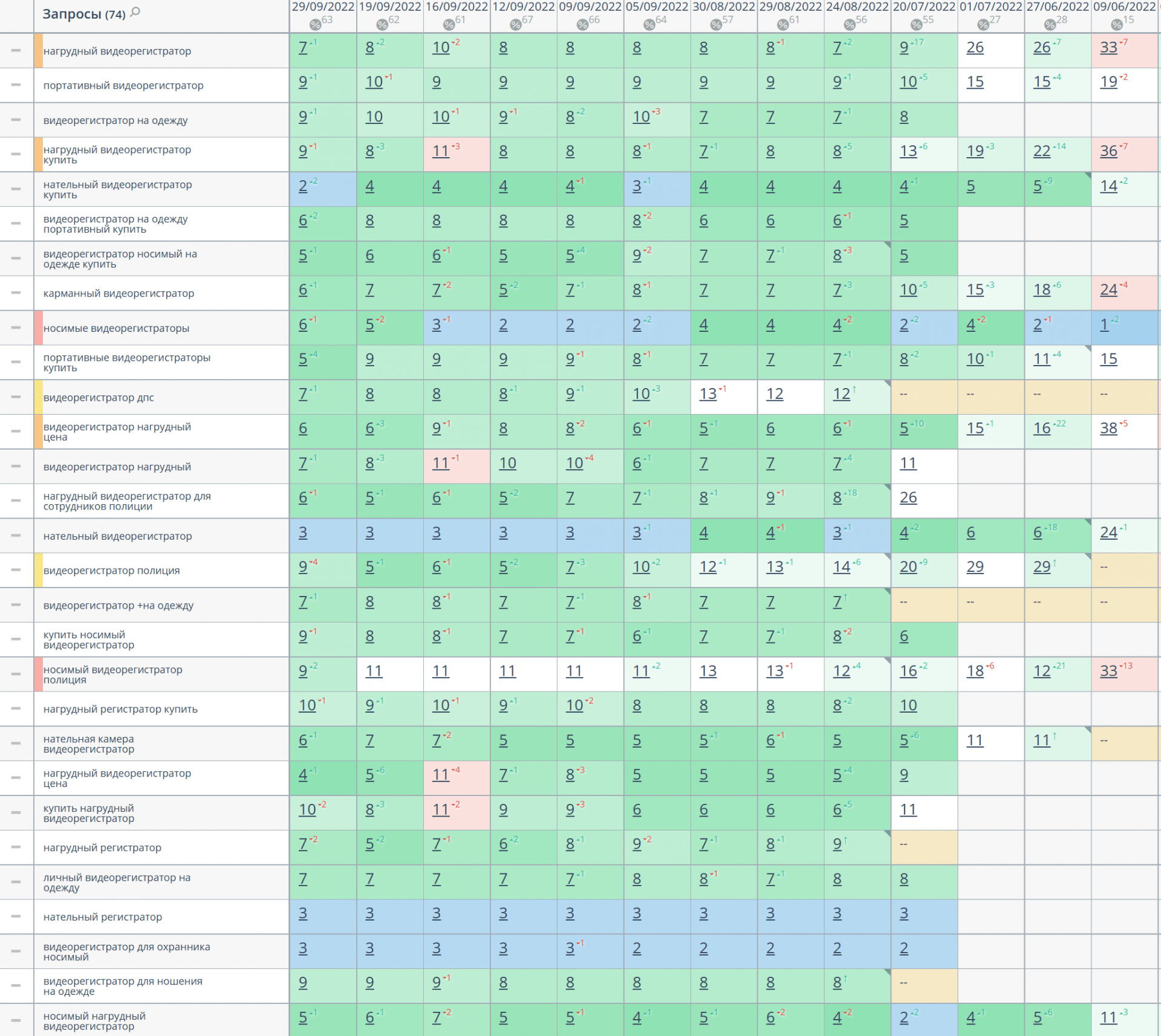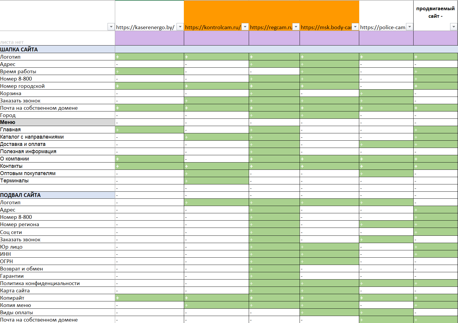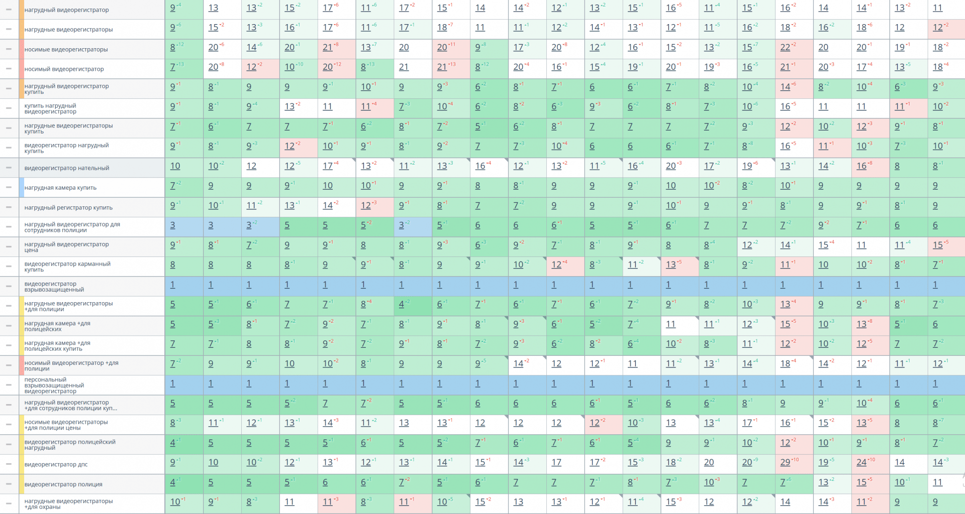 На основе основного маркерного запроса «Нагрудный видеорегистратор» была собрана база всех сайтов с данными направлениями. Все сайты были проанализированы на предмет схожести для исключения агрегаторов и крупных сайтов.