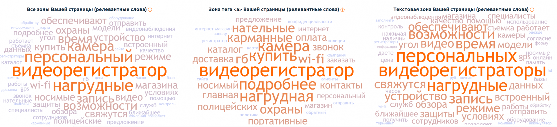 На основе собранных конкурентов из ТОП-10 были созданы облака тегов, которые позволяют наглядно увидеть, какие слова на их страницах используются чаще, а какие реже.