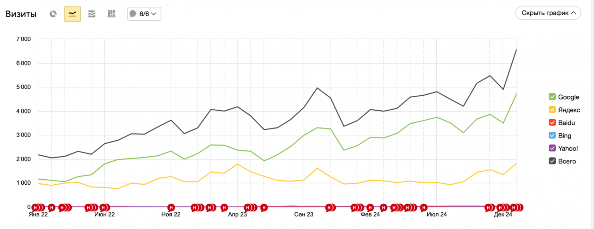 Сайт в последние 2 года стабильно растет в общем трафике из поисковых систем, а также по количеству целевых обращений. Дальнейшие работы будут нацелены на увеличение этих показателей ЕЩЕ В 2 РАЗА!