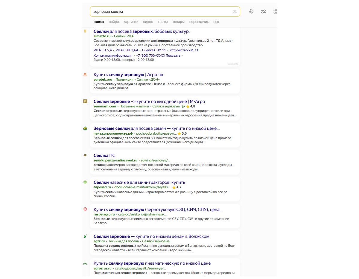 Первым этапом стал анализ выдачи по самому широкому запросу «купить зерновую сеялку». Он показал, что в ТОП-30 находятся всего 2-3 производителя сеялок (с лендингами вместо многостраничных сайтов), а все остальное – дилеры сельхозпродукции.