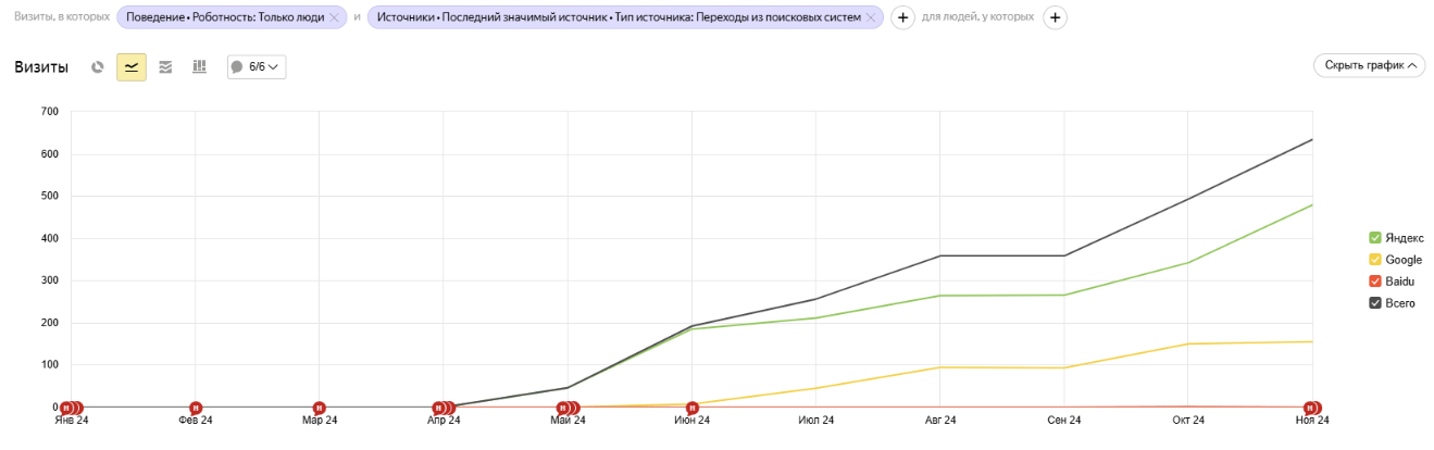 Первые заявки сайт начал приносить уже в августе 2024 года. В среднем с сайта приходило 6-8 заявок в месяц, но после того, как сайт «раскачался» и занял первые места выдачи, наш клиент стал получать 17-25 заявок в месяц. И это в нише с жесточайшей конкуренцией в один из самых тяжелых годов для дилеров и производителей сельскохозяйственной техники.